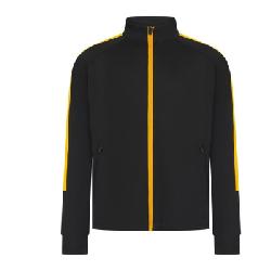 Knitted tracksuit top with contrast colour panels on outer sleeve. Contrast colour centre front zip. Zipped side pockets. Funnel neck and 1x1 ribbed cuffs